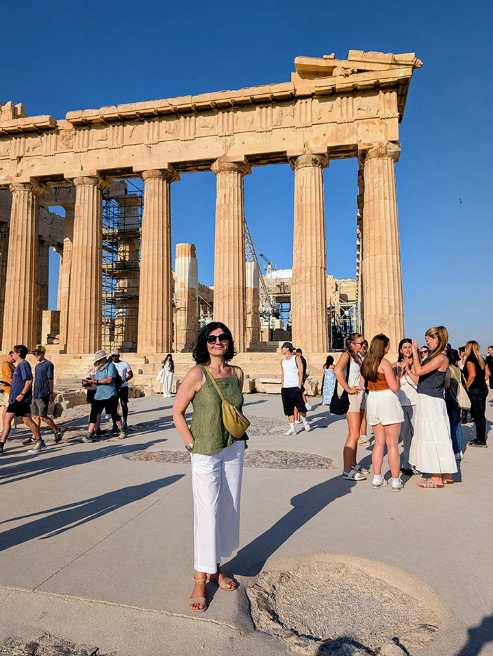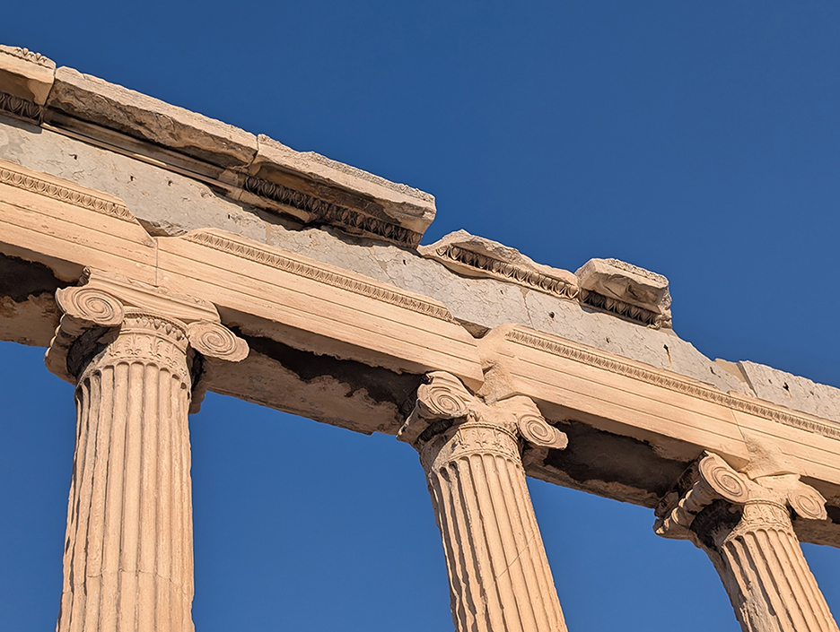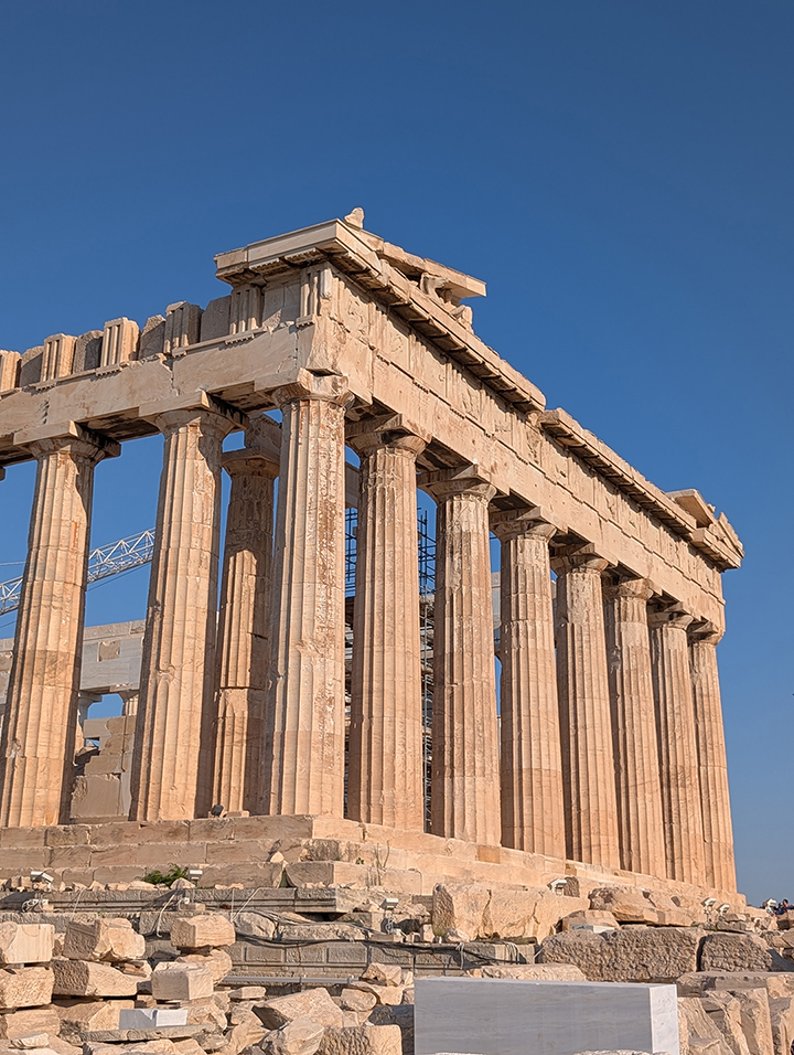 Партенон – ову до данас сачувану грађевину класичног стила, која се као храм посвећен грчкој богињи Атини одржала скоро хиљаду година – посматрале смо ћутке, задивљене лепотом спољних дорских ступова и метопа, иако оштећених, ипак, на неким деловима храма довољно видљивих и, наравно, талентом и умећем тадашњих вајара и клесара, на првом месту Фидија, који је (како прочитах) био задужен и за скулптуралну декорацију храма.