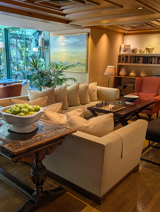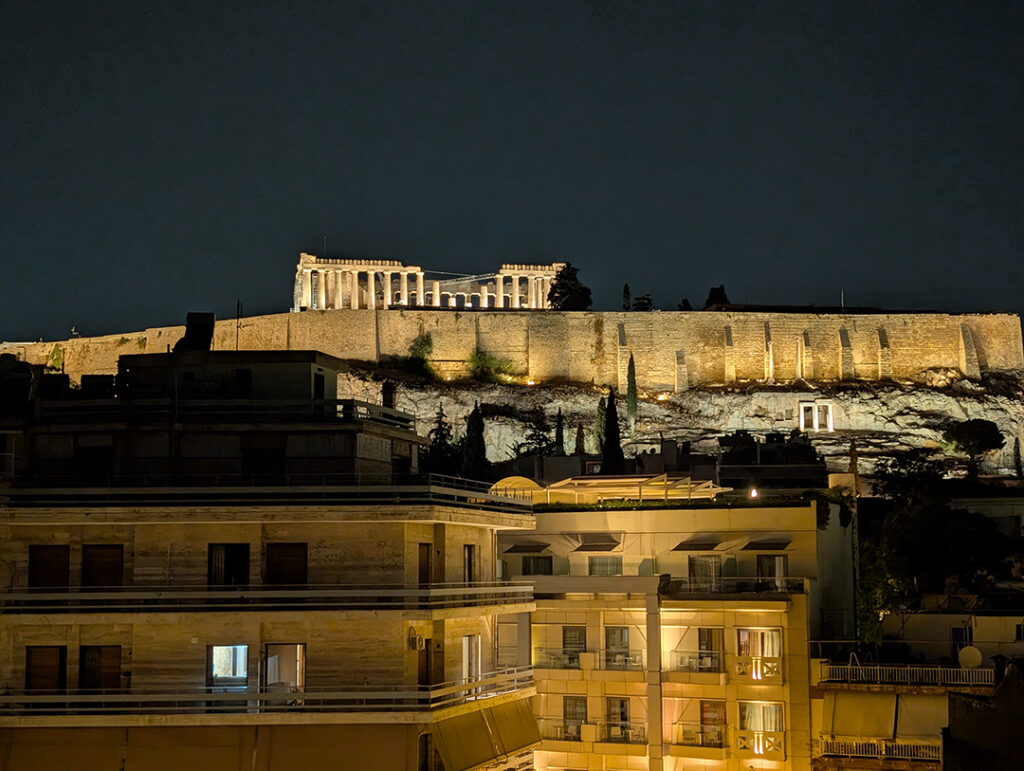 Врло лепа Гркиња, топлог гласа, на рецепцији Херодиона, на одличном енглеском, испричала нам је све оно најважније у вези с хотелом, од чега сам – сад већ од надолазећег умора – само запамтила која врата воде до трпезарије (где ћемо у наредних шест дана долазити на доручак), да је на крову хотела предивна тераса с погледом на Партетон и на ком спрату нам је соба.
