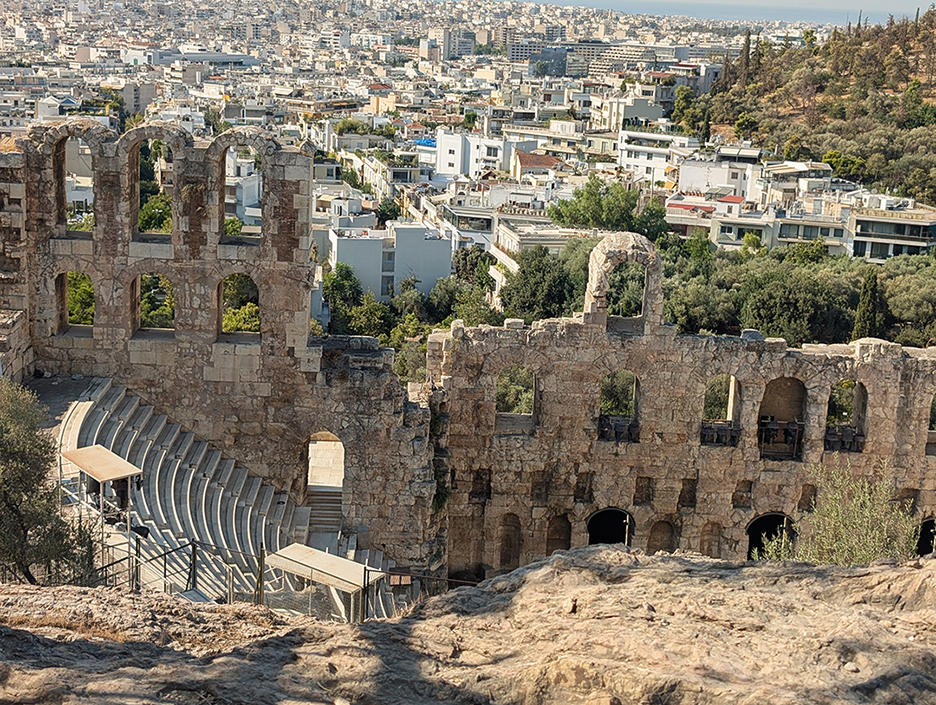 Ходајући по Акропољу, најпре смо наишле на Одеон Херода Атика – древно, камено римско позорише, тачније одеон, који се налази на југозападној падини Акропоља. Овај одеон су саградили Римљани 161. године нове ере, а финансирао га је богати атински доброчинитељ Херод Атик у спомен на своју покојну супругу Регилу. Нажалост, ово дивно античко здање Херули (германско племе) су оставили у рушевнима 267. године. Тек око 1950. кренуло се са обнављањем овог одеона, који од 1957. године служи као место где се сваког лета одржава чувени атински Епидаурус фестивал, један од најстаријих фестивала сценских уметности који се континуирано одржавају у Европи.